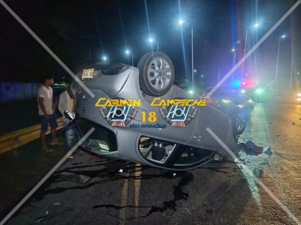 Huyen en taxi los ocupantes de un vehículo que volcaron sobre la avenida 4 carriles por conducir presuntamente a exceso de velocidad y en completo estado de ebriedad; taxistas fueron quiénes dieron parte a las autoridades.