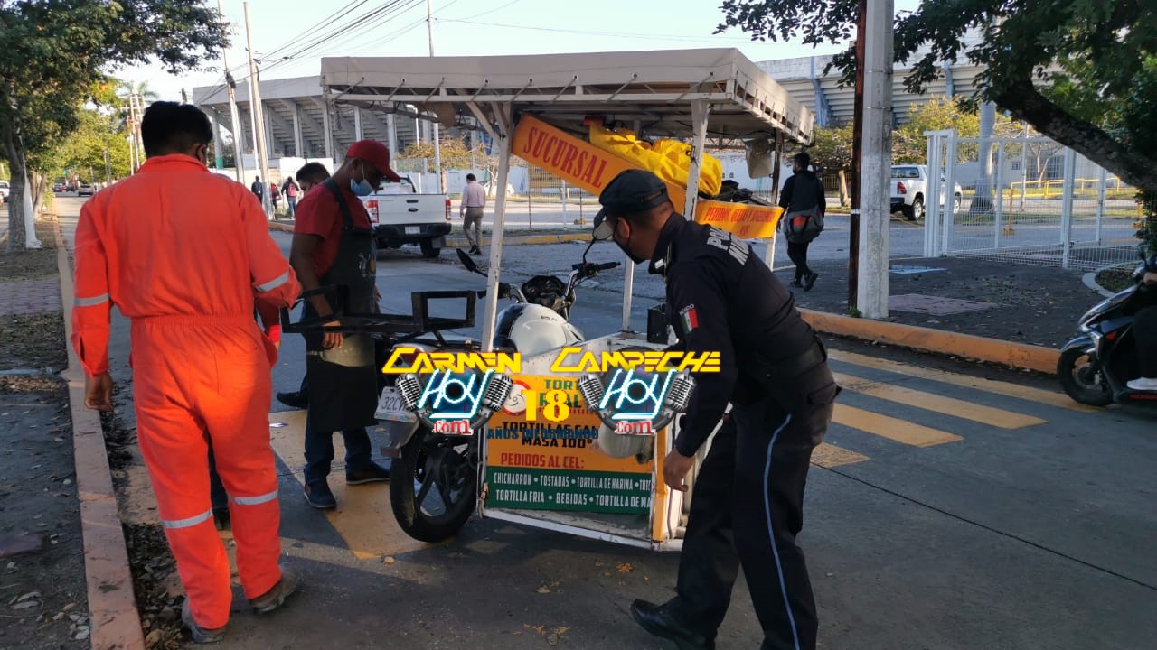 Accidente frente al estadio de la unacar, conductor de camioneta particular impacta en el costado lateral derecho a una motocicleta adaptada para vender tortillas y la voltea en plena avenida; el guiador de la motocicleta resultó con heridas menores en la mano.