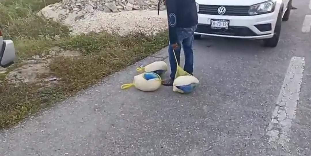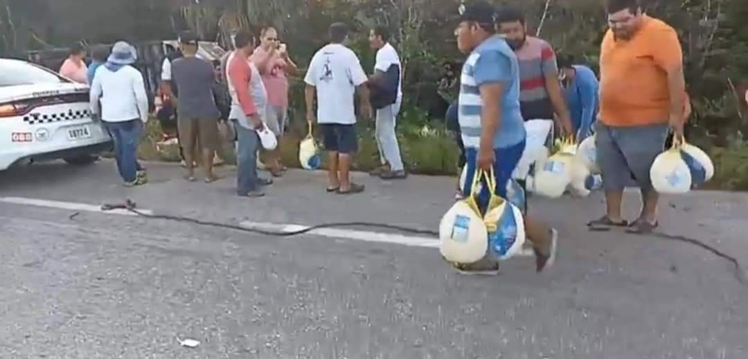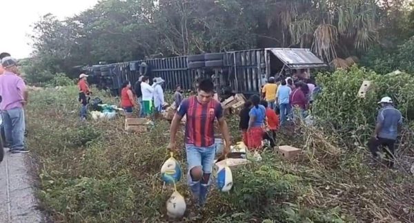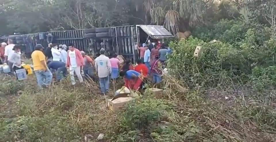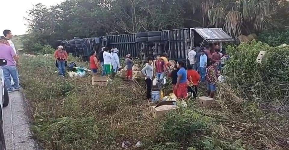 Un tráiler que transportaba pavos congelados se volcó esta tarde sobre la carretera Sabancuy – Champotón, por lo que automovilístas y pobladores cercanos al lugar rapiñaron la carga.