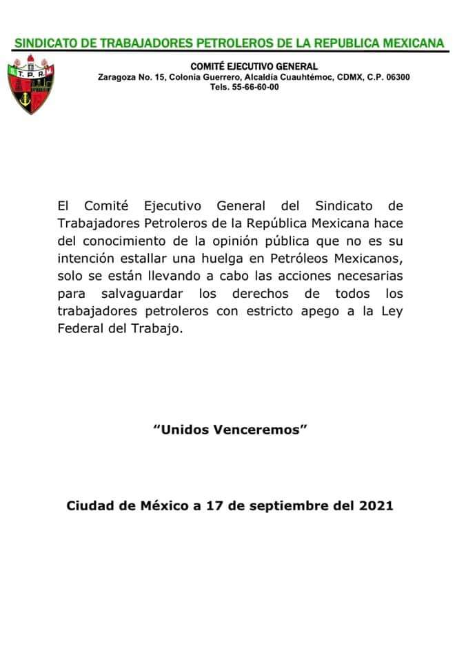 Atención sindicato de trabajadores petroleros, no hay intenciones de huelga, solo acciones necesarias para salvaguardar sus derechos.