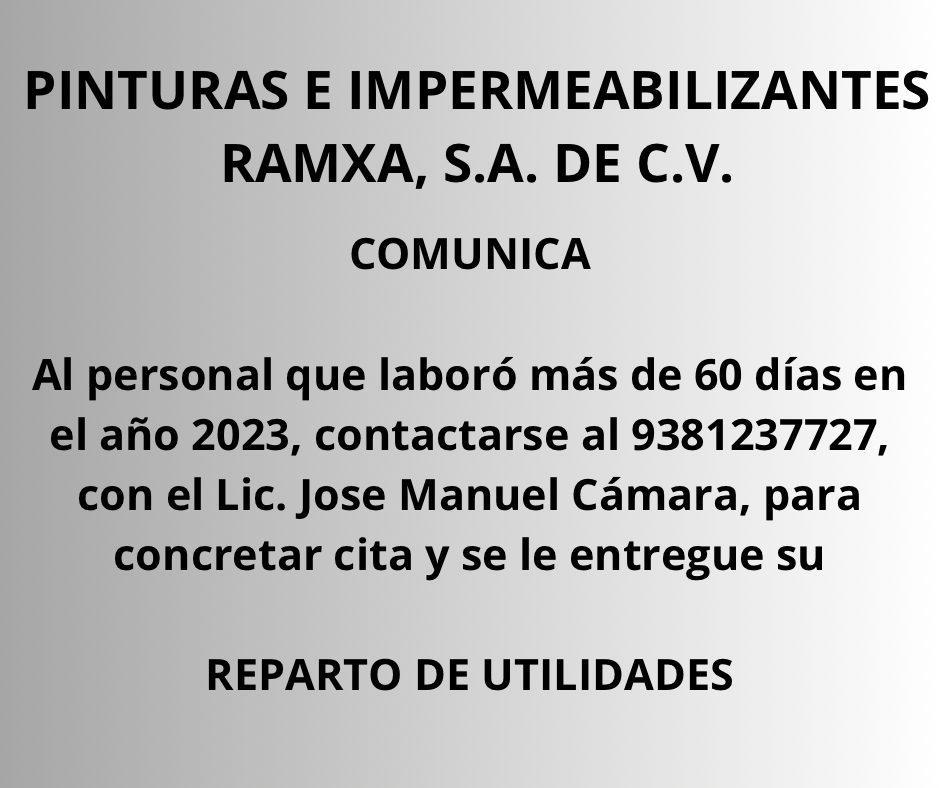 Al personal que laboró más de 60 días en el año 2023, contactarse al 9381237727, con el Lic. José Manuel Cámara, para concretar cita y se le entregue su REPARTO DE UTILIDADES